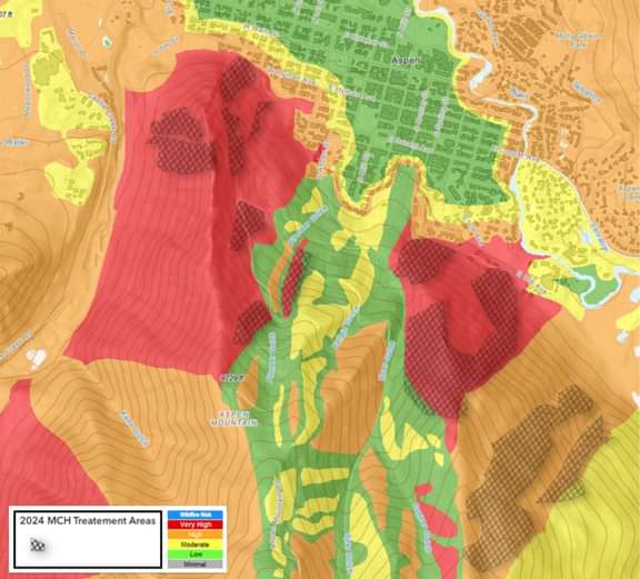 - Dead trees contribute to dry fuels which can become sources of ignition and contribute to hot and fast-moving wildfires. The treatment areas are classified as having very high wildfire risk. Aspen and its core border the treatment areas and are high-priority areas for protection via fuels mitigation efforts. See the map below which shows the overlay of treatment areas in relation to the high-risk areas.